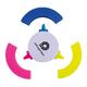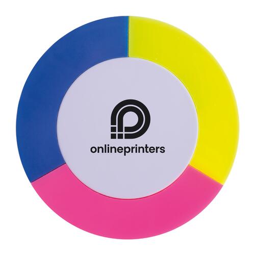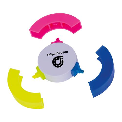 - The 3-in-1 highlighter features a pink, yellow, and blue marker