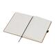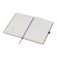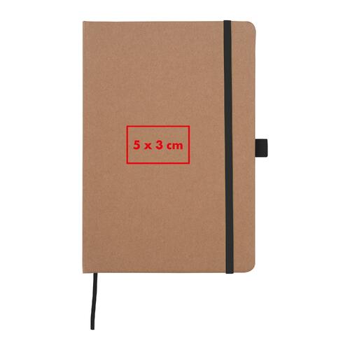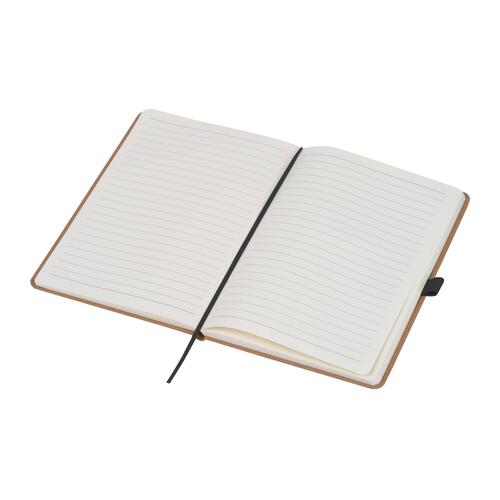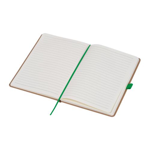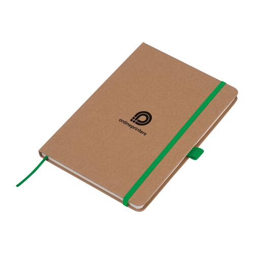 - A5 notebook made from recycled paper with 160 lined pages, a bookmark, and a pen loop color-coordinated with the elastic closure band