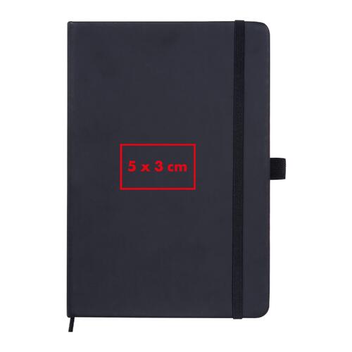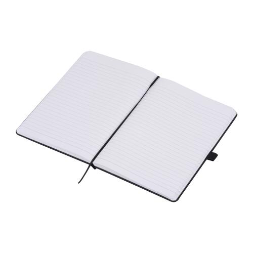 - A5 notebook with a PU cover, bookmark, elastic closure band, pen loop, and 120 lined pages made of stone paper