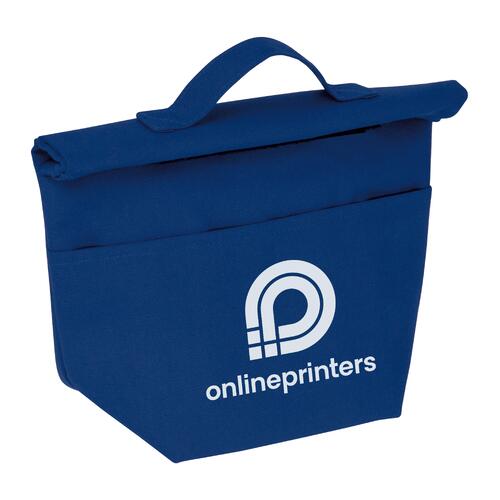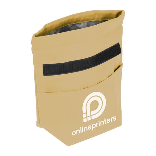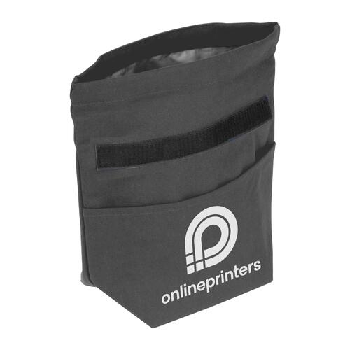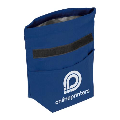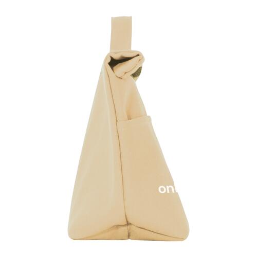 - The bag features a carrying handle, a wide hook-and-loop fastener for closure, and a front pocket