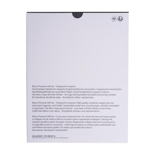 Promo items by MOLU are more than just a present. They are a statement for ‘modern luxury’ and a special kind of appreciation – from the unboxing moment to the sustainable use. MOLU premium gift set consisting of a notebook, an elegant ballpoint pen set and a magnetic card holder is a stylish and truly impressive present.