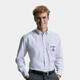 - button-down collar, left chest pocket, back shoulder yoke with two pleats inserted into the side of the yoke, back pleat with back seam; cuff adjustable with 2 buttons, curved hem line