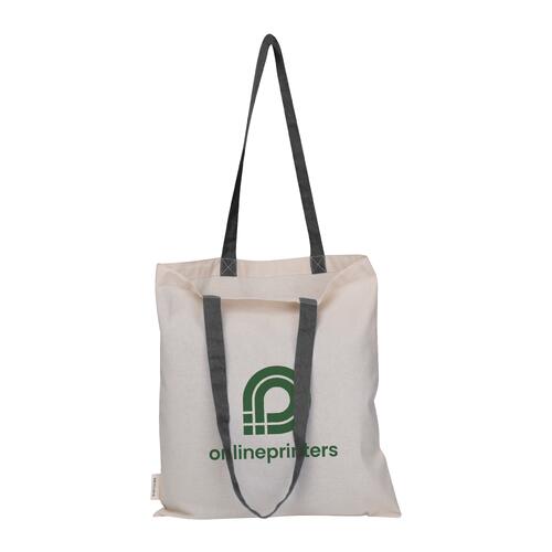 - Cotton bag with two long handles made of 75% recycled cotton and 25% recycled PET