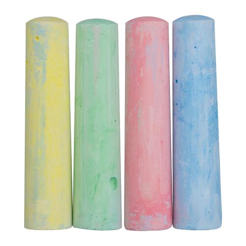 - Sidewalk chalk set consisting of 4 chalks in blue, red, green, and yellow, packaged in a cardboard box