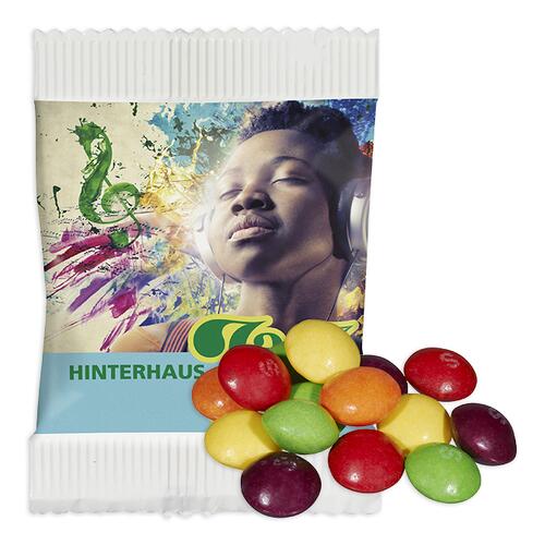 - average nutritional values SKITTLES® Fruit per 100 g: energy 1683 kJ / 397 kcal, fat 4.2 g, of which saturates 2.3 g, carbohydrate 89 g, of which sugars 74 g, protein 0 g, salt 0.02 g.